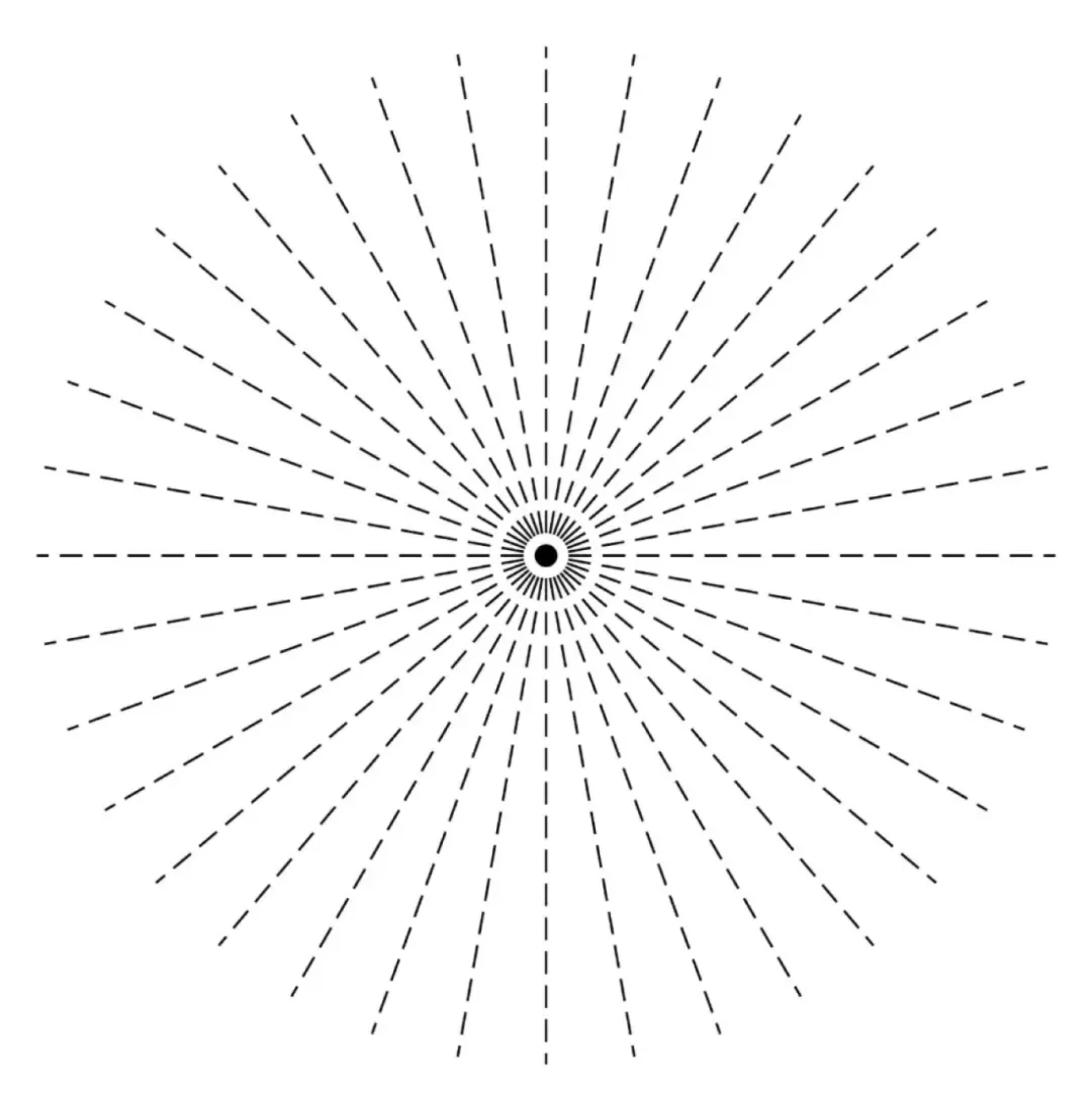 取下眼镜,将手机移至距离眼睛大约40厘米的位置(约一臂距离),用手遮住一只眼,单眼凝视上方散光表10秒,如果各线条深浅粗细一致,则没有散光。反之可能眼睛有散光。