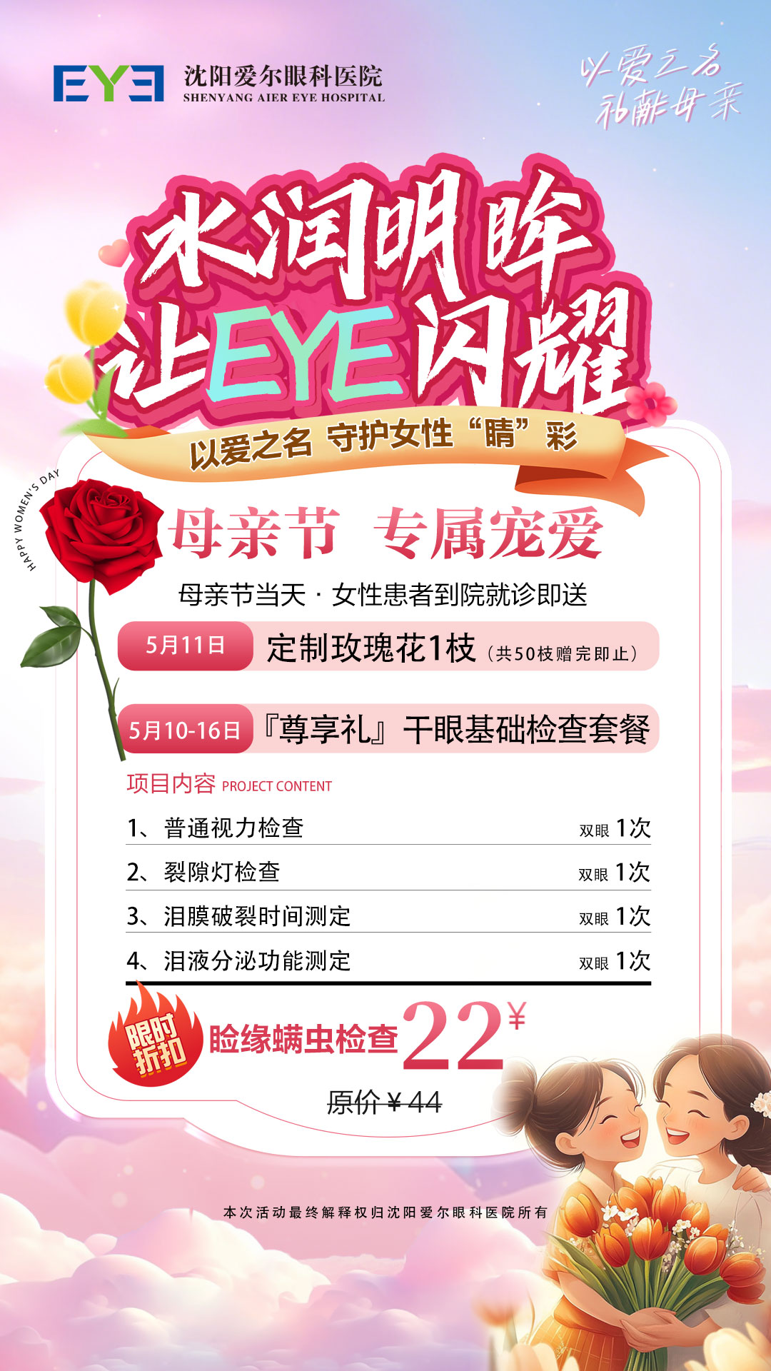 5月11日母亲节当天,女性患者到院就诊即可领取玫瑰花1枝? 活动期间,女性患者就诊可在导诊处免费领取?【干眼基础检查套餐券*1……