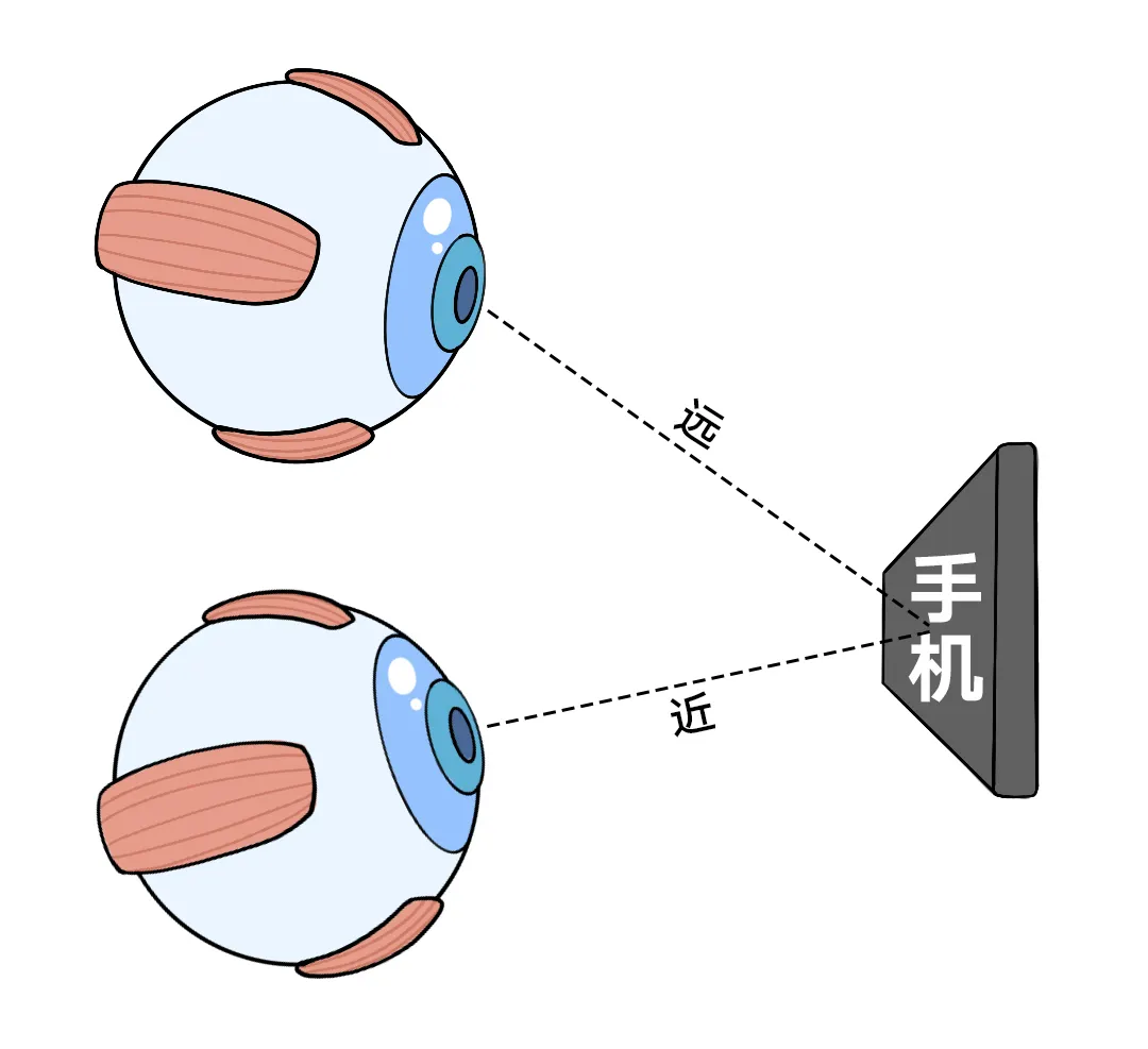 同时,在侧躺姿势下,两只眼睛与手机屏幕的距离不同,导致双眼的调节状态不均衡:上方眼睛距离屏幕较远,调节需求相对较少;而离手机较近的一眼则要付出更多的调节以看清屏幕,容易导致该眼近视进展更快,双眼屈光度差异逐渐增大,形成屈光参差。