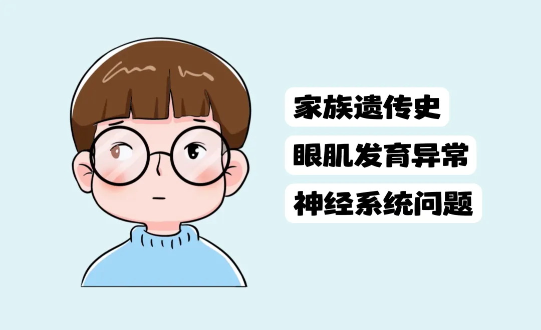 斜视主要与家族遗传史、眼肌发育异常或神经系统问题相关。其次,未及时矫正的屈光不正和早产、脑部损伤等均可能诱发斜视。
